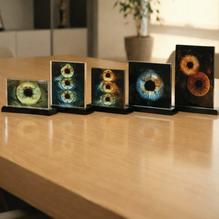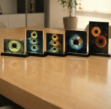 Aydınlatma entegrasyonuyla tasarlanan cam tablolar; irisinizin renk geçişlerini daha belirgin ve dramatik biçimde ortaya çıkarır. Ev tipi elektrik bağlantısıyla çalışır. Dekoratif bir obje olmanın ötesinde, mekânın atmosferini dönüştüren bir sanat nesnesidir.